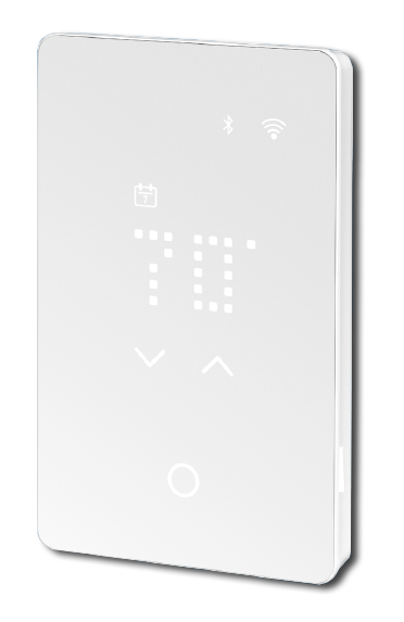 The advanced thermostat is available in an elegant white design with a plain surface. It has a discrete look and fits to most wall decorations.
